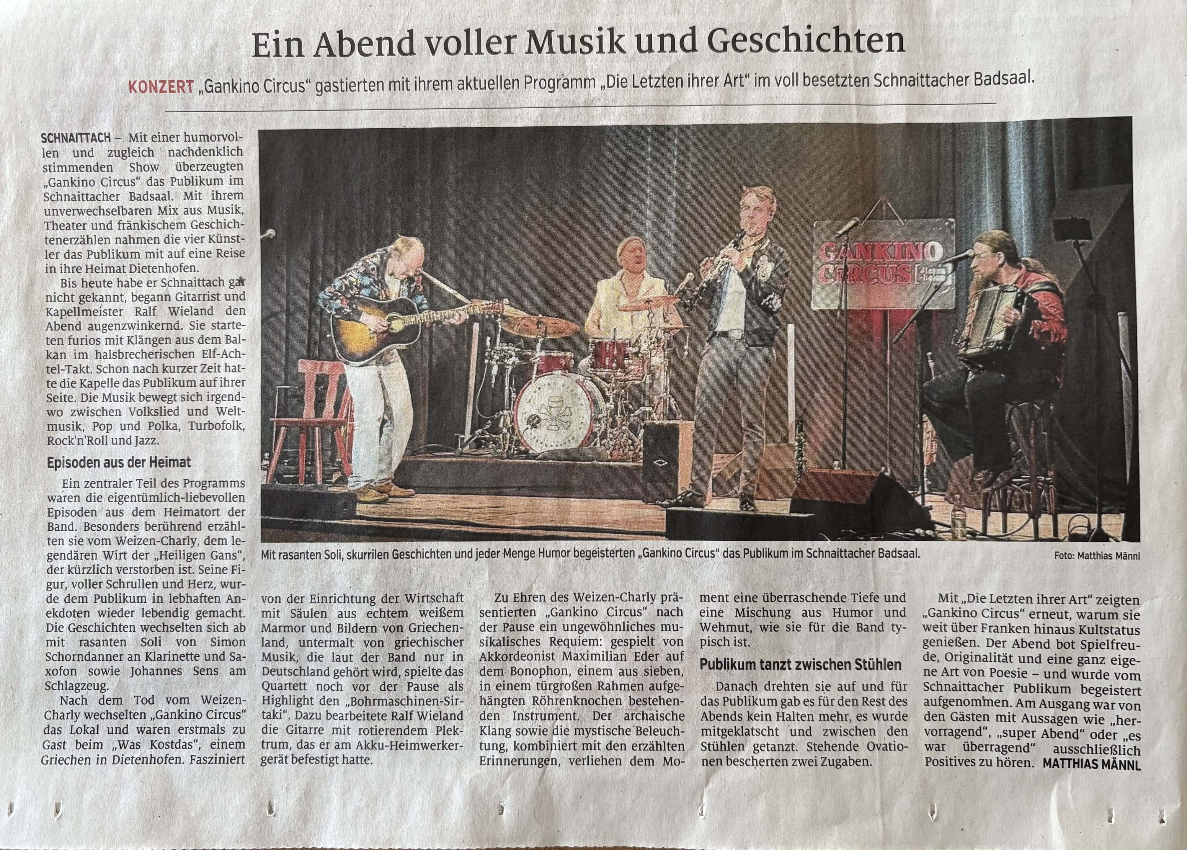 Warum Gankino Circus „weit über Franken hinaus Kultstatus genießen“? Das erfahren Sie im Artikel der Nürnberger Nachrichten, der über das Debüt von Gankino Circus im Badsaal in Schnaittach berichtet.
