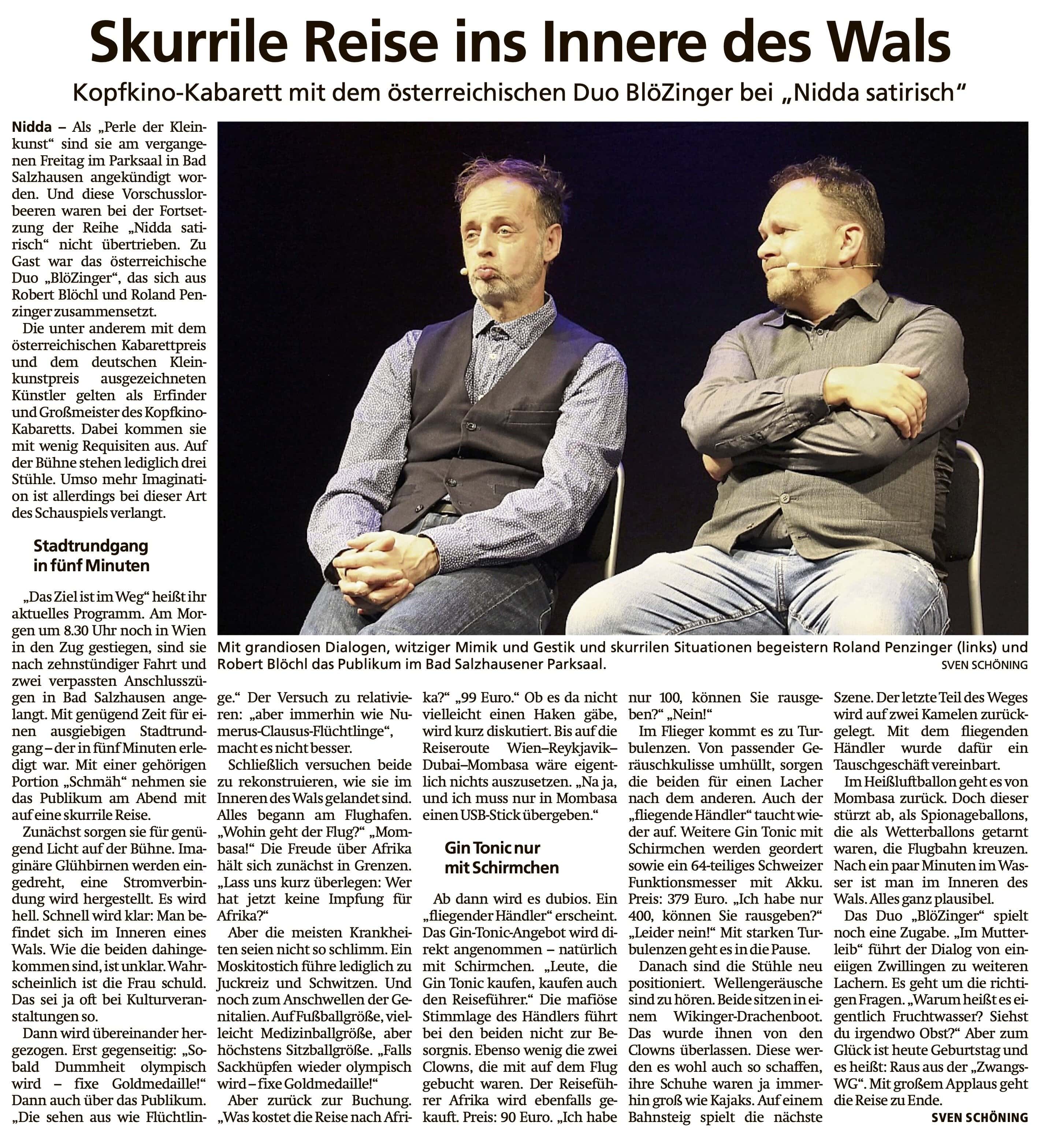 Am 30.01.26 gastierten BlöZinger mit ihrem Programm „Das Ziel ist im Weg“ in Nidda. Unter dem Titel „Skurrile Reise ins Innere des Wals“ schreibt die Presse: „Als Perle der Kleinkunst sind sie am vergangenen Freitag im Parksaal angekündigt worden. Und diese Vorschusslorbeeren waren nicht übertrieben.“ Den ganzen Artikel gibt es HIER.